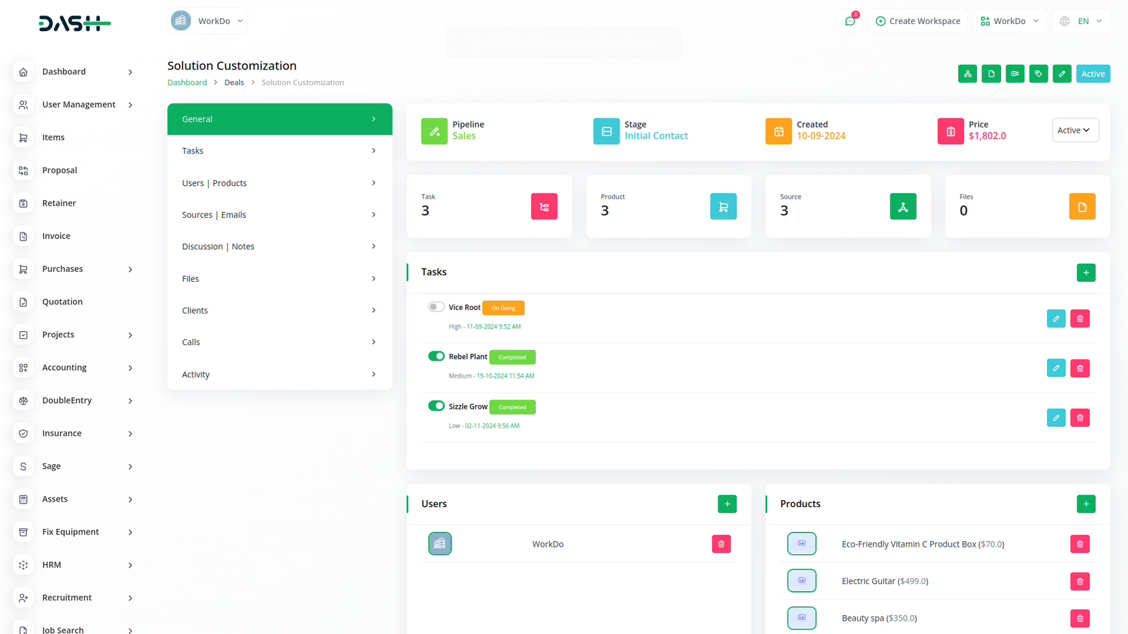 Get an actionable analysis of all your leads, deals, users, invoices, and products - in one interactive dashboard. Create and implement effective business plans, set a maximum number of deals, payment options and do so much more.